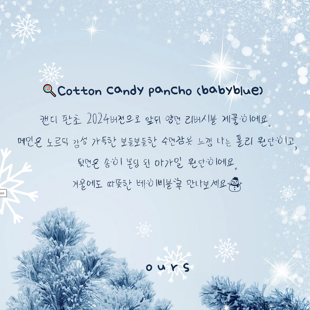 ✔️솜사탕 양면 판쵸는 브랜드 공장에서 경력 많은 이모님들께서 제작하고 있어요. 저희가 꼼꼼하게 검수해서 발송해드리지만 혹시나 하자가 있는 제품 수령 후 빠르게 연락 부탁드립니다.