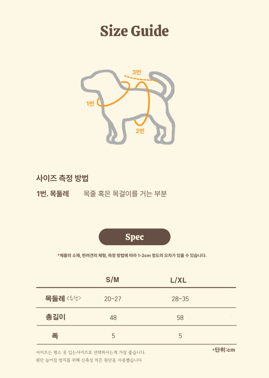 목둘레가 27cm 이하이거나 다리가 짧은 경우 → S/M 사이즈 추천