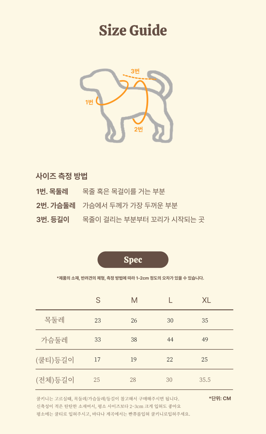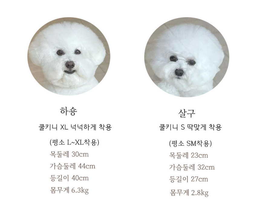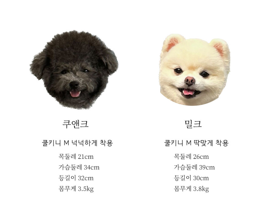 목둘레, 가슴둘레,(쿨티)등길이는