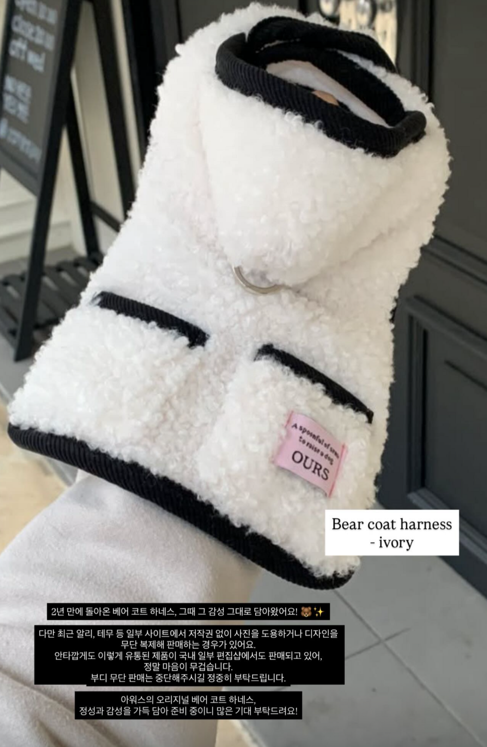 아워스의 오리지널 베어 코트 하네스,정성과 감성을 가득 담아 다시 준비 중이니 많은 기대 부탁드려요!