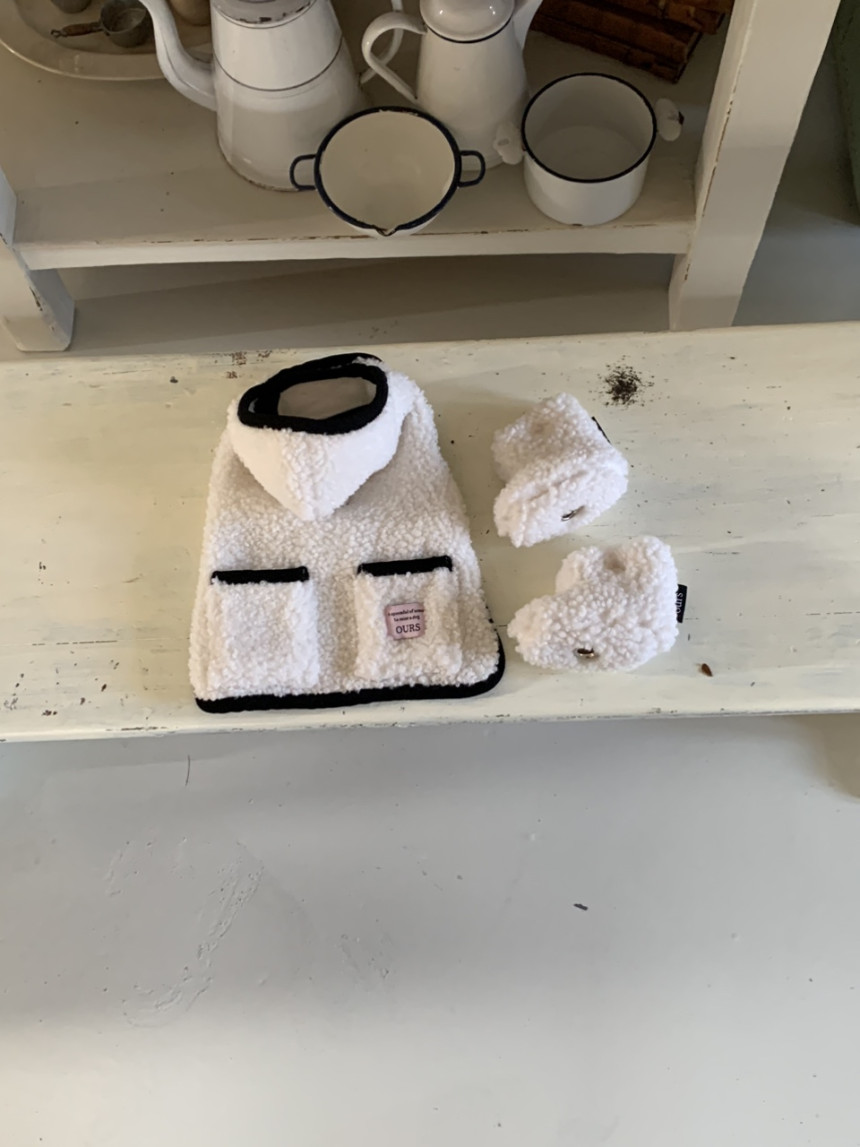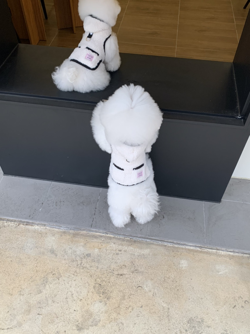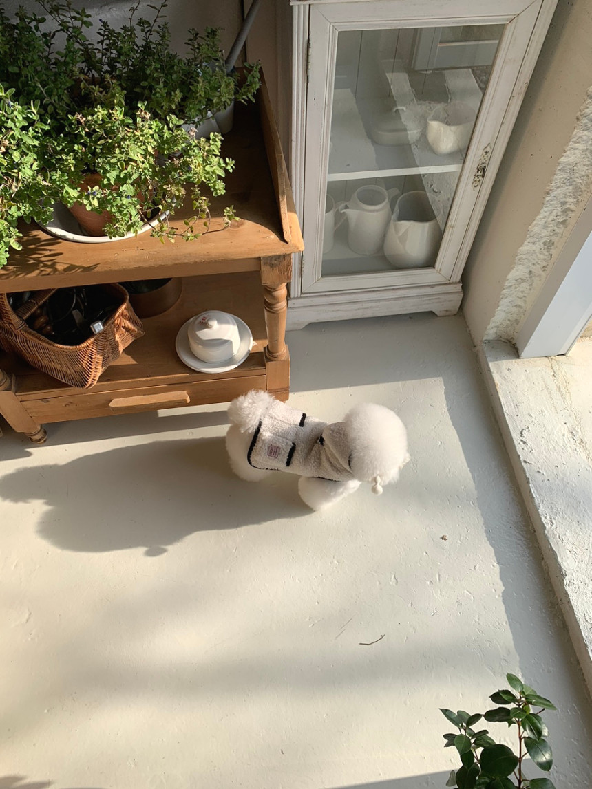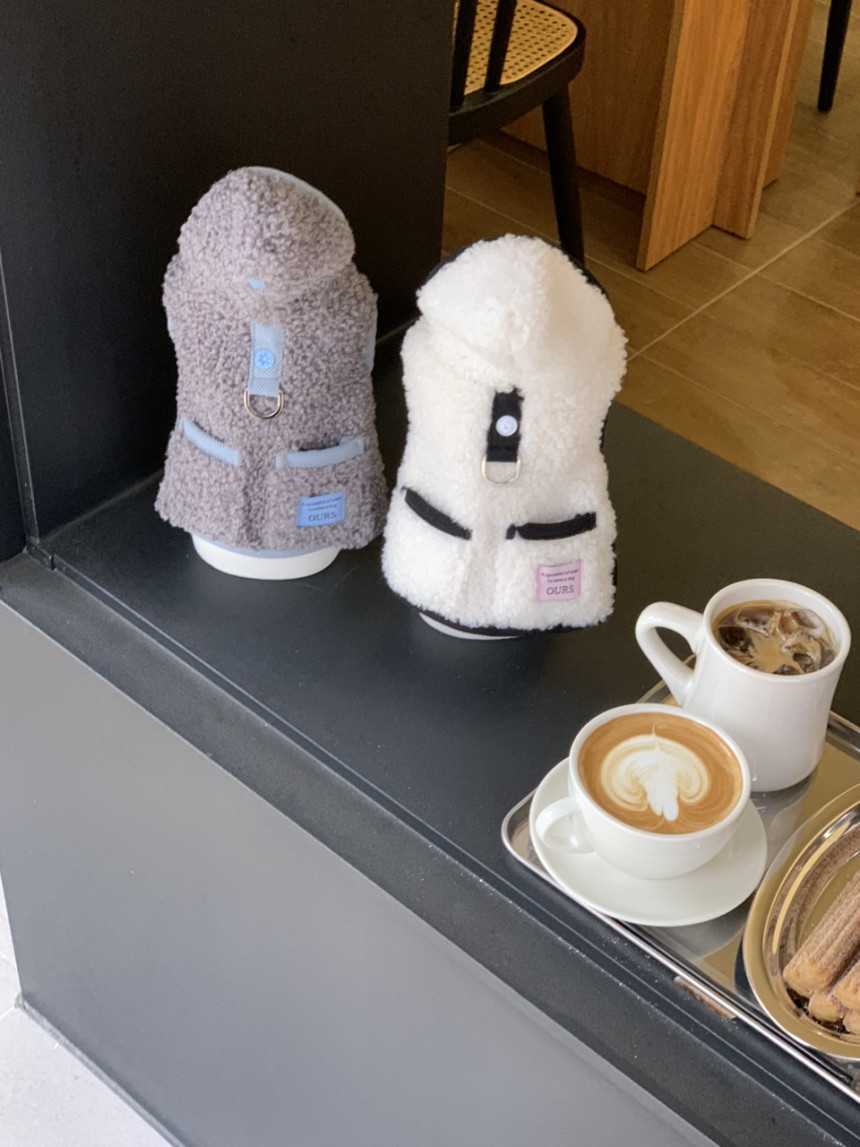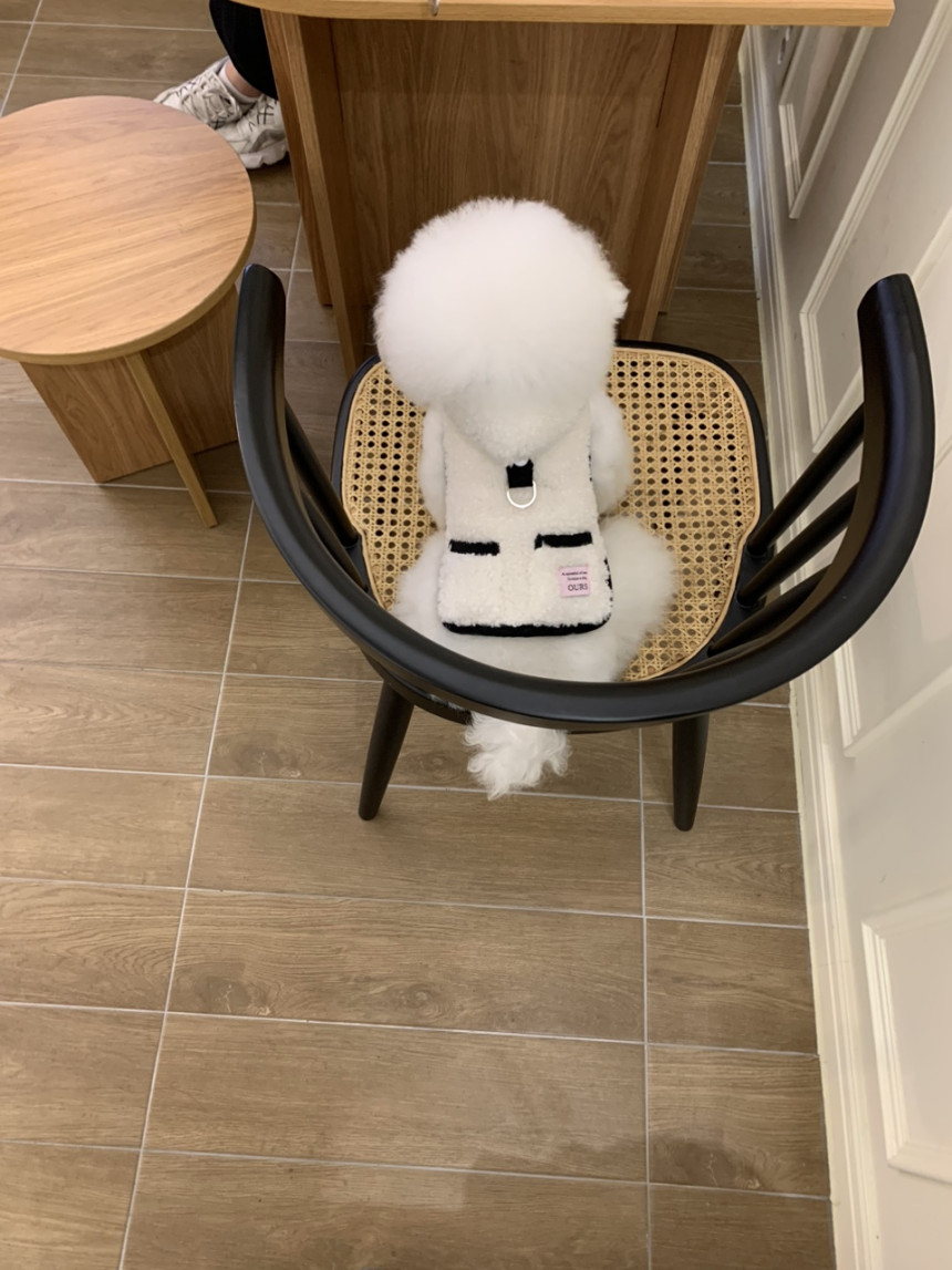 또한 뽀글이 원단이 탄탄하게 잘 나와서 산책 시 당김이 있는 친구들도 옷핏이 쉽게 흐트러지지 않는 점이 장점이에요.