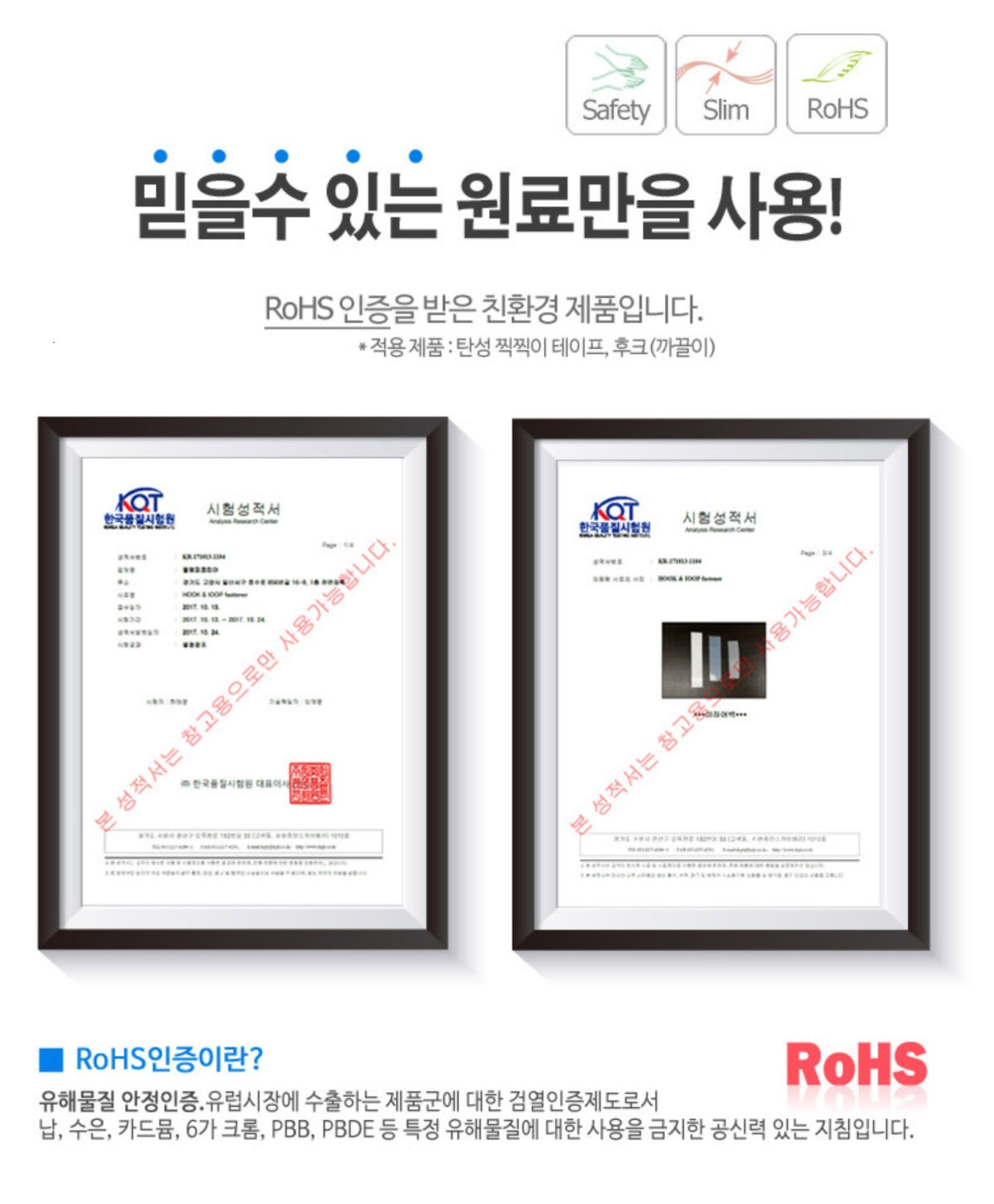 아워스는 RoHS 인증받은 친환경 고급 찍찍이를 사용합니다.